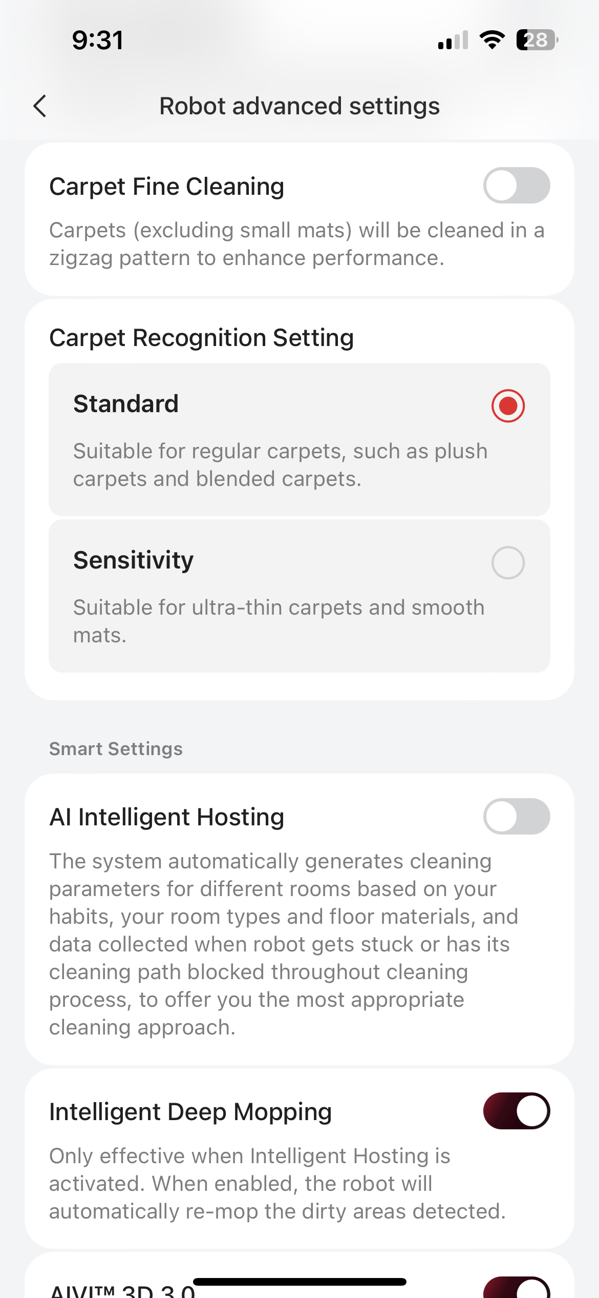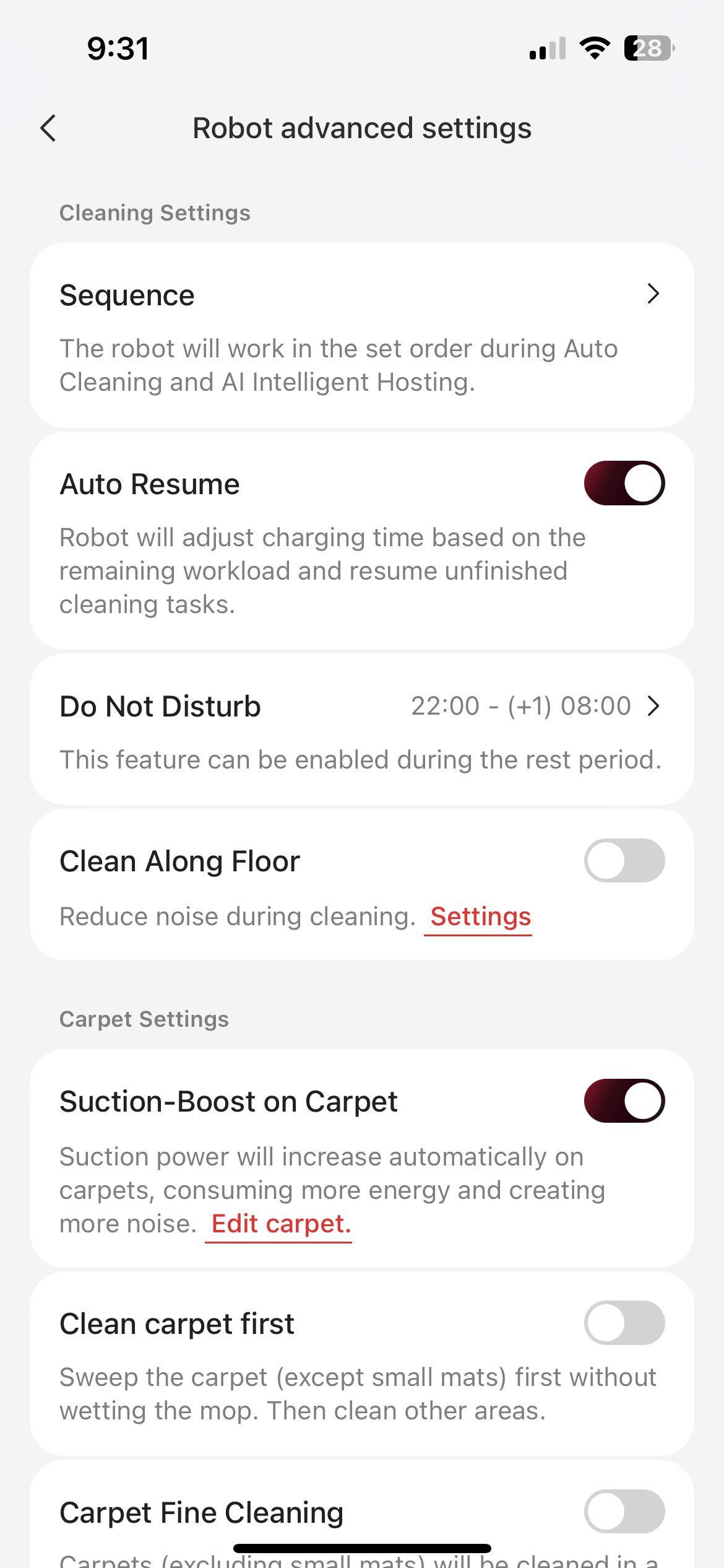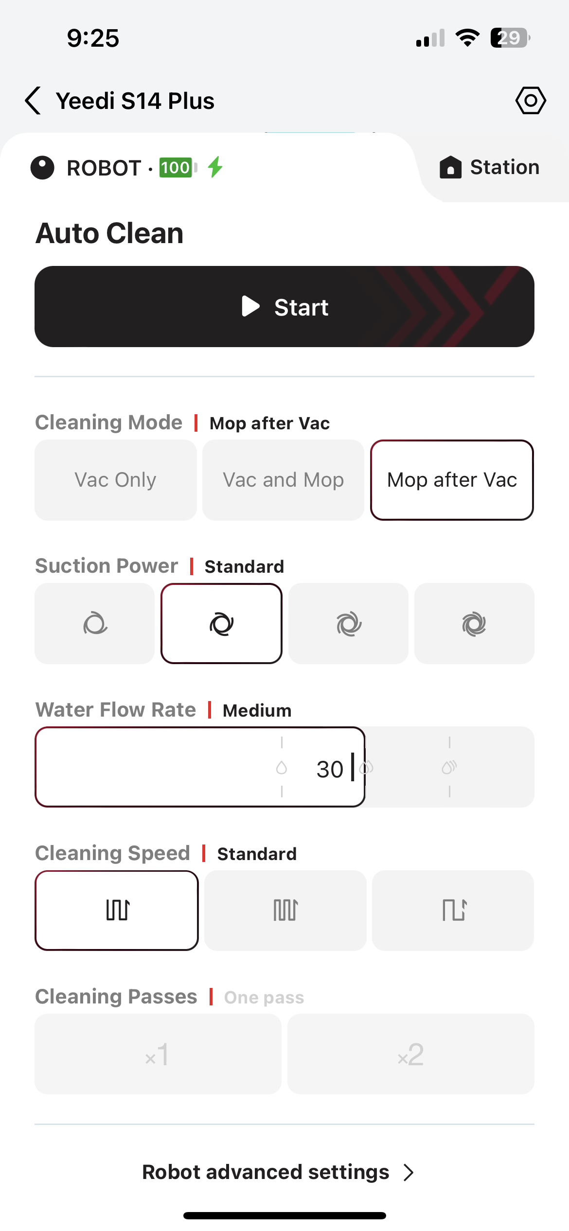 I’ve found that with most robot cleaners, especially in a home with cats who tend to track litter out of their box, mopping while vacuuming in one pass tends to smear it across sections of the floor, often leading to need it to make a second pass to properly clear up. Aside from that, I decided to save the settings at their standard levels, with a medium water flow rate for the mopping.