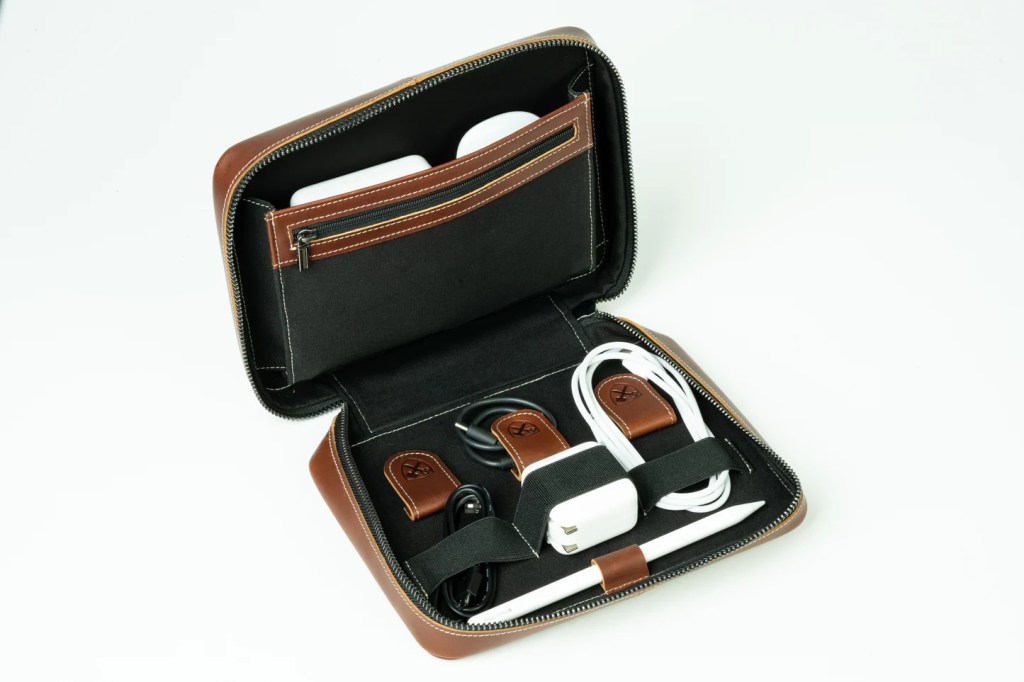 Handcrafted from premium American full-grain leather, the brand says the compact accessory “tames tangled cords and gadgets, becoming a loyal, long-lasting companion.”