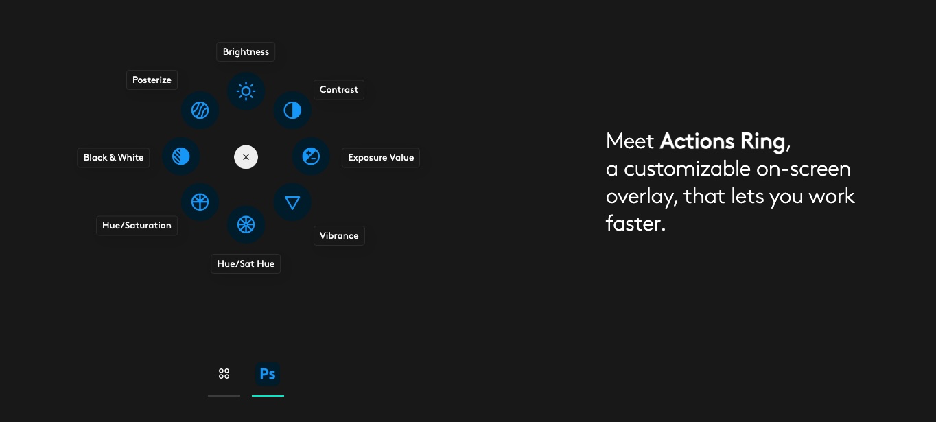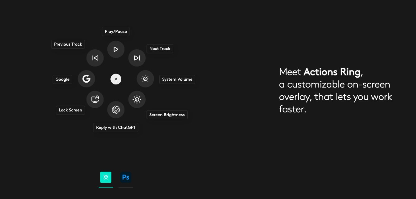 For those unfamiliar here, the Actions Ring is a Logi Options+ app-based digital overlay that floats atop your OS at the touch of a button – in its default state, when you click the side panel thumb button, the Actions Ring will pop up on display to offer up a ring of quickly-accessible actions. You’ll find “app-specific shortcuts and customizable controls” that delivers frequently used tools and commands front and center and immediately accessible alongside the ability to assign “commands in Photoshop or automating functions in Excel.”