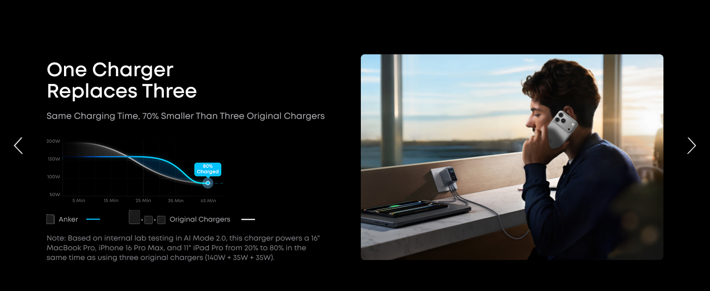 - One Equals Three: With smart power distribution powered by PowerIQ 5.0, power a 16″ MacBook Pro, iPhone 16 Pro Max, and 11″ iPad Pro in the same time as three original chargers (140W + 35W + 35W). Carry one instead of three and stay fully productive on the go.