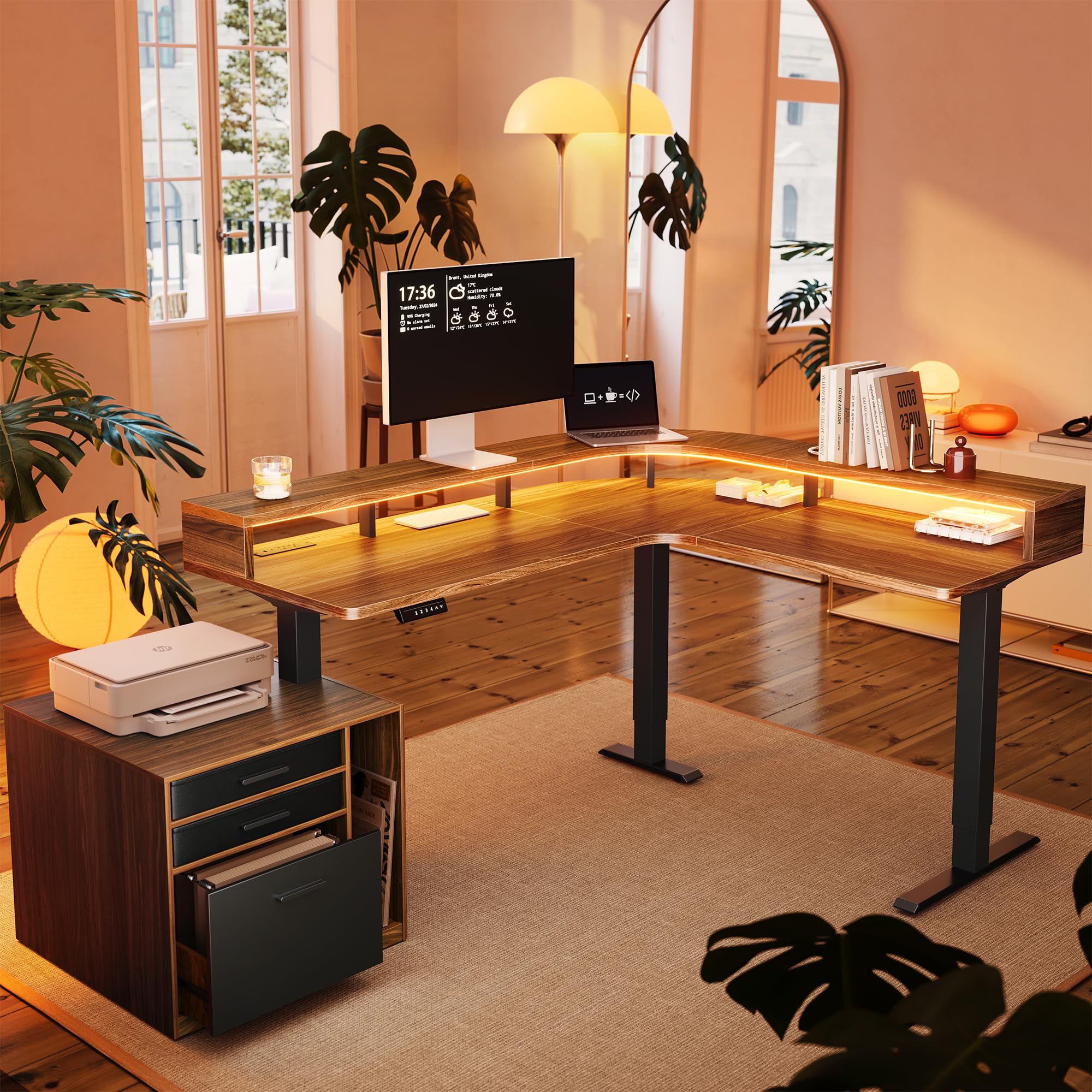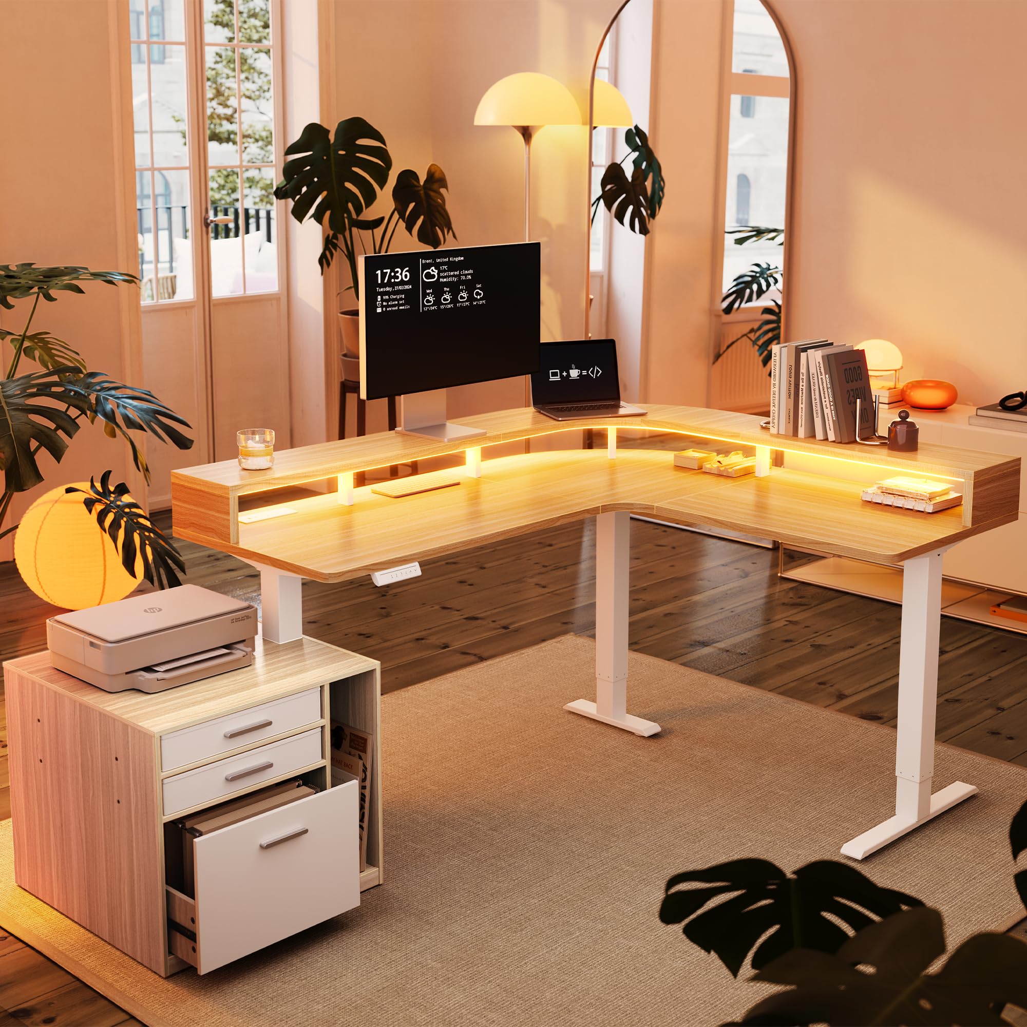 HUANUO L Shaped Electric Standing Desk with File Cabinet (Li