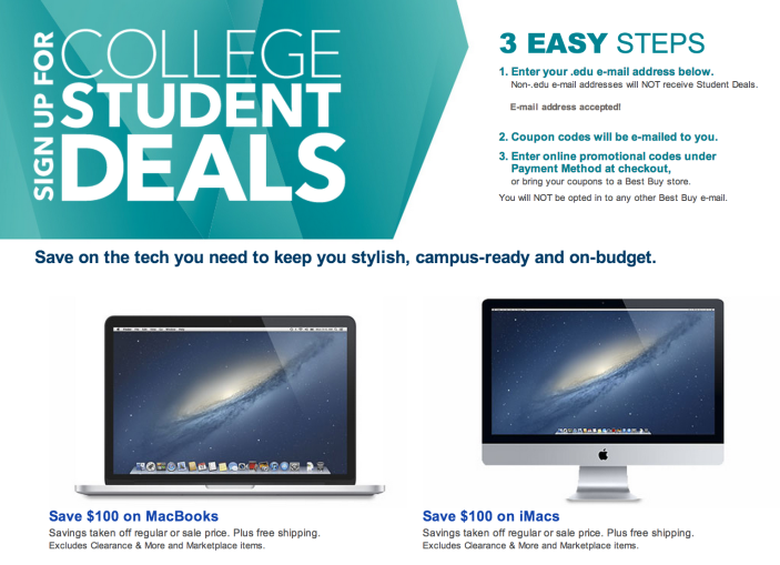 Best Buy is having a pretty significant sale this week on MacBook Airs, Retina/Pros and iMacs and Students or anyone with a .edu email address get another$100 off the sale prices signing up here. For instance the entry level Haswell MacBook Air is now $949 and another $100 drops it down to $849, the lowest price we’ve seen by $100.