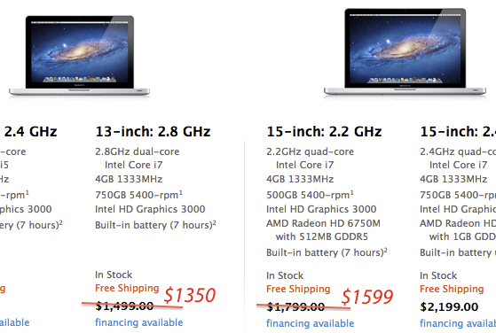 In addition, they have the base model 15-inch MacBook Pro for $1599. That’s $200 off of retail and again the lowest price we could find. It features an Intel Core i7-2635QM 2.2GHz quad-core processor, 15.4″ 1440×900 LED-backlit widescreen LCD, 4GB RAM, 500GB hard drive, SuperDrive, AMD Radeon HD 6490M 256MB video card with switchable graphics, 802.11n wireless, Bluetooth, Gigabit Ethernet, webcam, multi-touch touchpad, SDXC card reader, and Mac OS X 10.7 Lion.