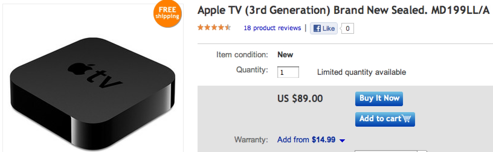 This latest-generation Apple TV displays 1080p widescreen video and features Netflix, YouTube, Vimeo, and Flickr integration, Airplay support, 802.11n wireless, Ethernet, HDMI video output, USB connectivity, and more. A 1-year Apple warranty applies. Apple offers a refurb with the same warranty for $85