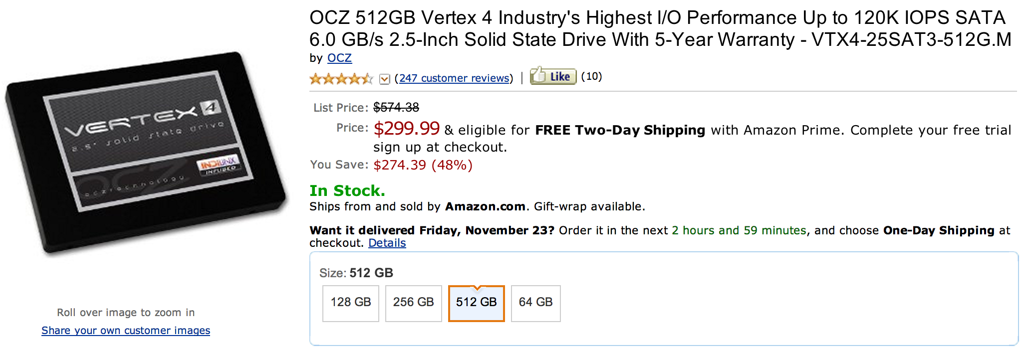 Amazon has the OCZ 512GB Vertex 4 SSD for $299. That’s the lowest price we’ve ever seen on one of, if not the fastest SATA 3 SSDs out there.