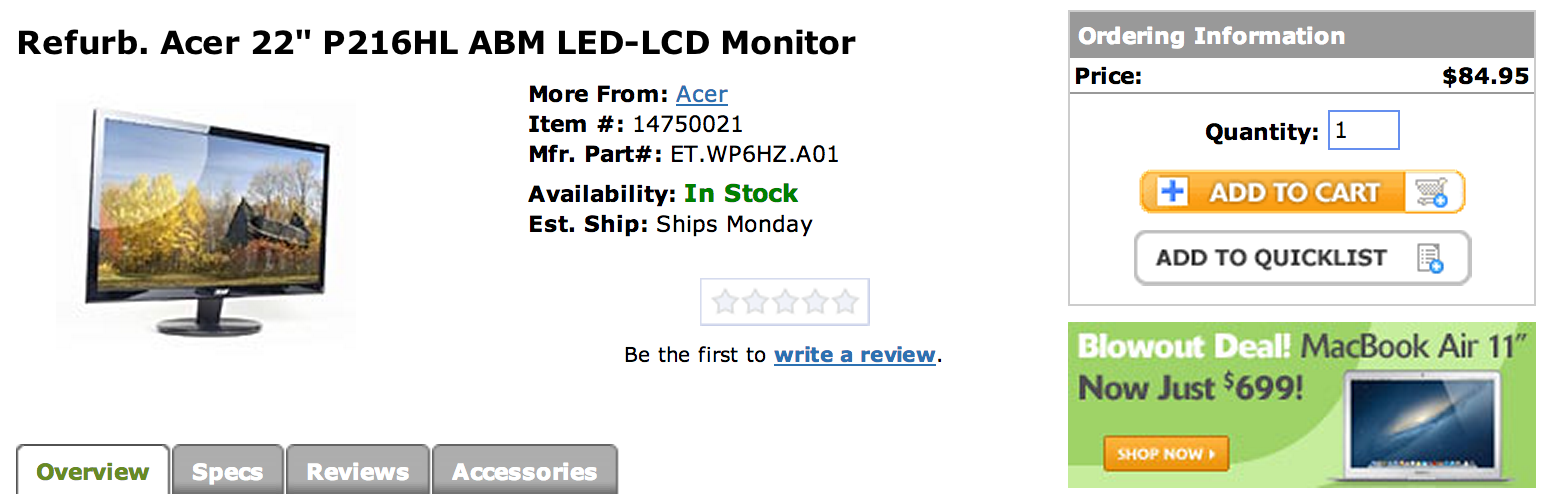 As part of its TechHolidays sale, MacConnection has the Acer P216HL 22″ Display for $84.95 (refurb)with free shipping. That’s the lowest price we’ve seen for a 1080P display. Ever.