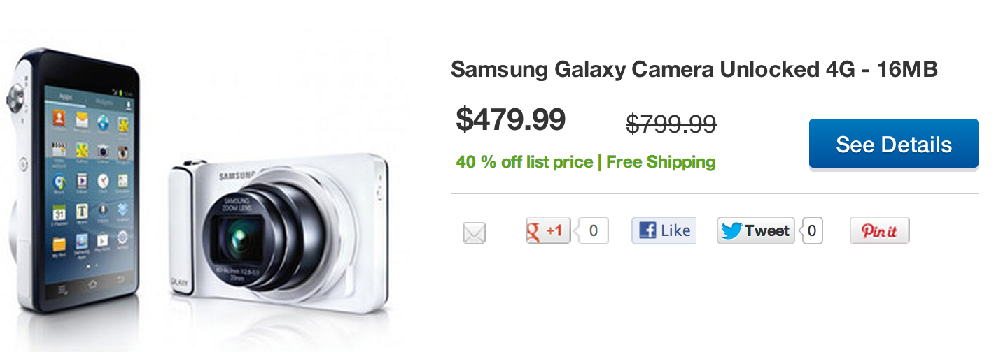 Daily Steals via Ebay Daily deals has the Samsung Galaxy Camera for $479.99 with free shipping. That’s $20 off of the AT&T price plus it comes without a commitment or tax in most states. The Galaxy Camera runs Android 4.1 and has a MicroSD card bay for adding storage.